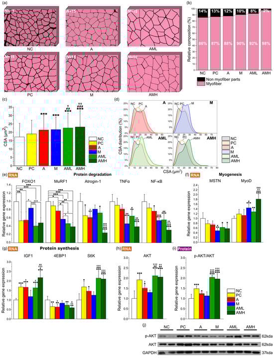 To analyze the extract’s effect on muscle strength improvement in more detail, hematoxylin and eosin (H&E) staining was performed on GA muscle from each treatment group to evaluate histology and measure myofiber cross-sectional area (CSA). The AMH group had the highest proportion of myofibers within the consistent area in comparison to other groups, while the NC group exhibited the lowest proportion (Figure 3a,b). Analysis of muscle fiber CSA revealed a significant increase in average fiber size in both the A and M groups compared to the NC group (Figure 3c,d). Notably, the AML groups showed an even more significant increase in average CSA compared to the A and M groups (Figure 3c).
