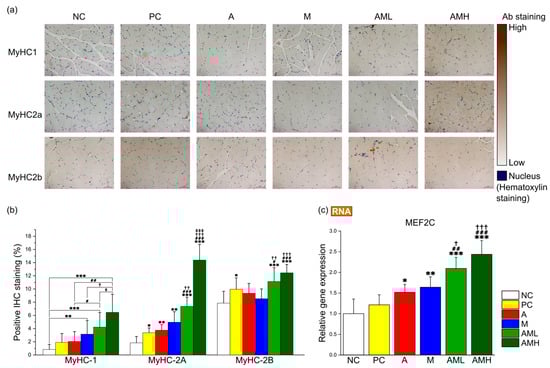 To elucidate the molecular mechanisms underlying the observed changing muscle fiber type composition, the focus was placed on genes related to muscle fiber type switching, particularly those associated with slow-twitch fibers, which are crucial for muscle endurance (myocyte enhancer factor 2C: MEF2C). Analysis of MEF2C gene expression revealed a significant upregulation in all groups (A, M, AML, and AMH), except for the PC group, compared to the NC group (Figure 5c). Notably, the AML group exhibited a significantly higher expression level than the A and M groups, suggesting there is a synergistic effect between two extracts (Figure 5c).