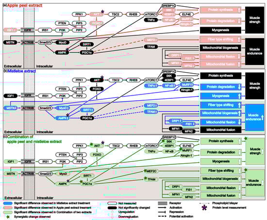 The mechanism underlying the effects of each extract on muscle strength and muscular endurance when administered individually or in combination. (a) Apple peel extract enhances muscle strength by increasing protein synthesis and decreasing protein degradation. It also enhances muscular endurance by increasing muscle fiber type shifting, increasing mitochondrial fusion, and decreasing mitochondrial fission. (b) Mistletoe extract enhances muscle strength by reducing protein degradation and promoting myogenesis. It also improves muscular endurance by shifting muscle fiber types, increasing mitochondrial biogenesis, and decreasing mitochondrial fission. (c) The combination of apple peel and mistletoe extracts enhance muscle strength and muscular endurance. The genes marked with a green star showed statistically significant changes when administered a combination of two extracts, compared to when each extract was administered alone. The genes marked with a purple asterisk (AMPK and AKT) were measured not only at the RNA level but also at the protein level.
