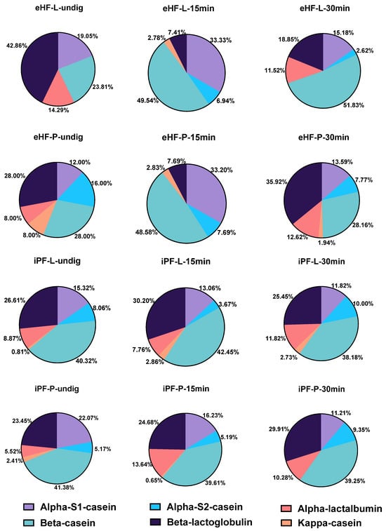 Additionally, a high amount of the peptide TQTPVVVPPFLQPE (amino acids 93–106 of β-casein) was found in eHF-L after 30 min of in vitro digestion (>585 × 106 for quant value) and in iPF-P after 15 min of in vitro digestion (>746 × 106 as quant value).