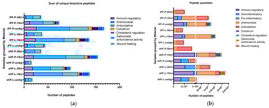 (a) Sum of unique bioactive peptides per peptide group found in the 12 formula samples. (b) Number of bioactive peptides per peptide group found in the 12 formula samples.