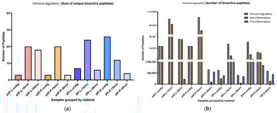 (a) Sum of unique bioactive peptides found among immuno-regulatory peptides per formula sample and digestion status; (b) Number of bioactive peptides found among immuno-regulatory peptides per formula sample and digestion status.