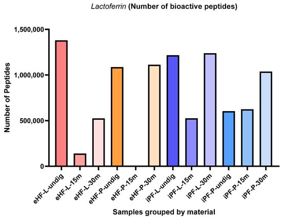 The numbers of antimicrobial peptides per sample are presented in Figure 7b. The highest quantity of antimicrobial peptides was found in eHF-L after 15 min of in vitro digestion (>13 × 106 antimicrobial peptides’ quant value), followed by iPF-L (>11 × 106 peptides’ quant value), and eHF-P (>913 × 106 quant value), both after 15 min of in vitro digestion, and undigested iPF-P (>780 × 106 quant value).