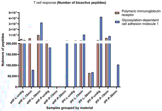 Across all samples, two bioactive peptides with functions related to T cell response were found: polymeric immunoglobulin receptor (pIgR) [] and glycosylation-dependent cell adhesion molecule 1 (GlyCAM1) [] peptides. PIgR is a 100–120 kDa type 1 transmembrane protein and is involved in the transport of IgM and IgA in the gut epithelium. GlyCAM1 is a mucin-like endothelial glycoprotein and is part of the milk mucin complex.