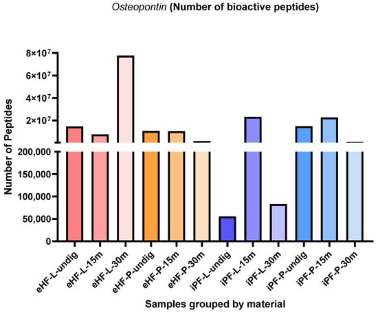 The numbers of osteopontin peptides per sample and digestion status are presented in Figure 6. The highest quantity of osteopontin peptides was found in the eHF-L sample after 30 min of in vitro digestion (>77 × 106 osteopontin peptides’ quant value), while the lowest quantities were found in undigested iPF-L (<56 × 103 quant value) and iPF-L after 30 min of in vitro digestion (<83 × 103 quant value).