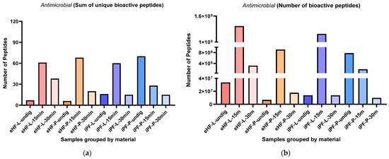 (a) Sum of unique bioactive peptides found among antimicrobial peptides per formula sample and digestion status. (b) Number of bioactive peptides found among antimicrobial peptides per formula sample and digestion status.