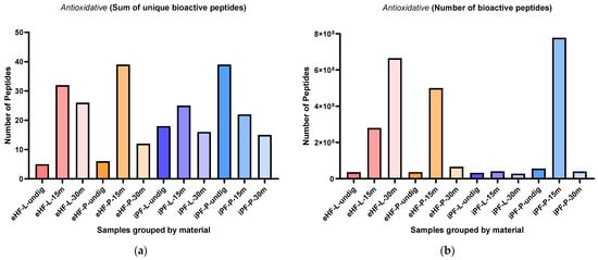 The sums of unique antioxidative peptides per sample and digestion status are presented in Figure 8a. The highest sum of unique antioxidative peptides was found in eHF-P after 15 min of in vitro digestion and in undigested iPF-P (each with 39 unique antioxidative peptides), followed by eHF-L after 15 min of in vitro digestion (32 peptides), eHF-L after 30 min of in vitro digestion (26 peptides), and iPF-L (25 peptides) and iPF-P (22 peptides), both after 15 min of in vitro digestion.