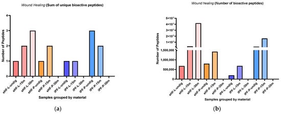 (a) Sum of unique bioactive peptides found among wound healing peptides per formula sample and digestion status. (b) Number of bioactive peptides found among wound healing peptides per formula sample and digestion status.