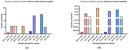 The numbers of antioxidative peptides per sample and digestion status are presented in Figure 8b. The highest quantity of antioxidative peptides was found in the iPF-P sample after 15 min of in vitro digestion (>1.3 × 109 antioxidative peptides’ quant value), followed by eHF-L after 30 min of in vitro digestion (>665 × 106 quant value), and eHF-P (>499 × 106 quant value) and eHF-L (>280 × 106 quant value), both after 15 min of in vitro digestion.
