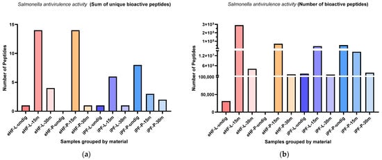 The sums of unique antimicrobial peptides per sample and digestion status are presented in Figure 7a. The highest sum of unique antimicrobial peptides was found in the undigested iPF-P sample (70 unique antimicrobial peptides), followed by eHF-P (68 peptides), eHF-L (61 peptides), and iPF-L (60 peptides), all after 15 min of in vitro digestion.