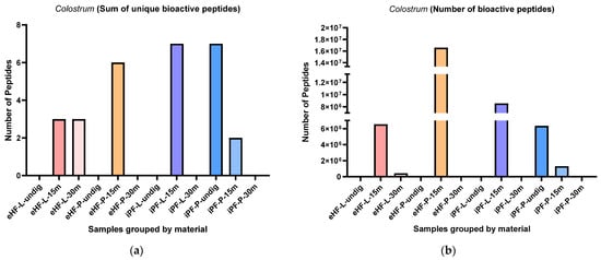 (a) Sum of unique bioactive peptides found among peptides known from colostrum per formula sample and digestion status. (b) Number of bioactive peptides found among peptides known from colostrum per formula sample and digestion status.