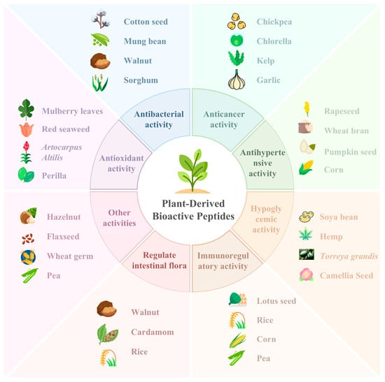 With increased awareness of environmental pollution, animal cruelty, and the negative health effects of animal-based foods, consumers are turning to plant-based vegan alternatives [1]. The EAT-Lancet Commission report also points to a shift towards more plant-based diets to meet the UN Sustainable Development Goals and the Paris Agreement, as well as using the Earth Healthy Diet as a reference for healthy and sustainable diets for a growing population [2]. In recent decades, plant-derived bioactive peptides (PDBPs) have attracted much attention due to their low cost and environmental sustainability. The use of plants as ingredients in food and other industries is widely accepted worldwide, so there is no religious or sociocultural prejudice against their use [3]. In addition, sources of PDBPs include legumes, grains, nuts, fruits, vegetables, and so on [4,5]. Compared with animal sources, PDBPs have abundant sources, simple preparation and low cost, and have a good development trend [6,7].
