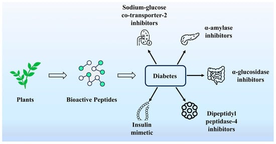 Diabetes mellitus is a serious and complex chronic metabolic disease characterized by elevated blood glucose due to insulin resistance or inadequate insulin secretion [103]. Recent processing technologies and human nutrition have identified plant proteins as an important source of food-derived bioactive compounds. These bioactive peptides are potential active ingredients. Among them, bioactive peptides with hypoglycemic activity can alleviate the hyperglycemic state and achieve blood glucose lowering without the help of drugs [104]. As shown in Figure 6, α-amylase, α-glucosidase, and so on are key enzymes that regulate blood glucose. Inhibiting the activity of these enzymes is considered an effective strategy for controlling diabetes. It has been shown that the peptides TGGR, SPVI, FY, and FR obtained from hemp (Cannabis sativa L.) protein by identification, molecular docking, and virtual screening exhibited good α-glucosidase inhibitory activities, respectively. Animal experiments showed that these peptides could regulate blood glucose and blood lipids in hyperglycemic rats [105]. Multi-enzyme hydrolyzed Amygdalus communis L. purified by ultrafiltration showed the best inhibitory activity of active peptide B4 against α-amylase and α-glucosidase [106]. TGPs-75 obtained from Torreya grandis meal peptides significantly reduced blood glucose concentrations. According to transcriptome analysis, 382 genes were significantly differentially expressed after TGPs-75 pretreatment. The main functions of these genes were related to gluconeogenesis and insulin resistance. This study suggests the possibility of using peptides from camellia seeds in camellia seed cake as hypoglycemic compounds for the prevention and treatment of diabetes [107]. Rapeseed-derived ELHQEEPL showed significant dipeptidyl peptidase-IV (DPP-IV) inhibitory activity [108]. Currently, there are also legume peptides and hydrolysates that have shown significant hypoglycemic effects by various methods [109]. For example, soybean peptides produced by alkaline protease hydrolysis exhibited the highest hypoglycemic activity by Xu et al. By analyzing their molecular weight distribution and amino acid composition, a positive correlation between the aromatic and hydrophobic amino acid content of the alkaline protein hydrolysate and the hypoglycemic activity was found [110].