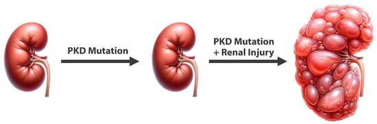 The saying that “genes load the gun, but lifestyle pulls the trigger” is conventional wisdom in medicine and widely accepted for many of today’s non-communicable diseases, including cancer, cardiovascular disease, diabetes, diabetic nephropathy, and many more. However, among healthcare practitioners, ADPKD is not considered to fall under this wisdom even though animal experiments have already clearly demonstrated this years ago. A series of landmark findings showed that inactivation of the Pkd1 gene in mature mice is largely inconsequential and does not lead to polycystic kidney disease for a very long time [17]. However, if the animals are challenged with any form of renal injury subsequent to the Pkd1 gene deletion, this injury triggers rapid renal cystic disease [18]. These findings led to the concept that renal injury is required for cystogenesis and CKD progression in ADPKD, in addition to the underlying gene mutation [18]. The idea is that renal injury triggers innate renal repair mechanisms that would normally resolve acute kidney injuries (AKI). However, in ADPKD, the renal repair mechanisms—once triggered—will go out of hand and continue persistently (Figure 1).