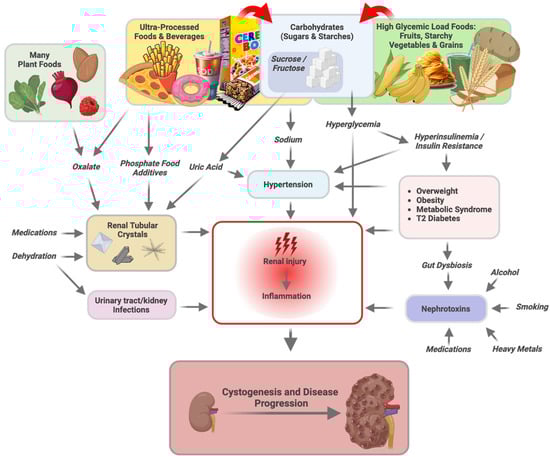 Mechanistic animal experiments have demonstrated that hyperglycemia not only leads to renal structural and functional damage but also triggers cystogenesis and PKD disease progression in a genetically predisposed mouse model [19]. Altogether, it is clear that diet and lifestyle factors that lead to poor metabolic health and, eventually, T2D are triggers of ADPKD progression. The underlying mechanisms are likely largely identical to those that lead to diabetic nephropathy. Dietary carbohydrates that contribute to a glycemic load encompass (1) simple sugars in mono- or disaccharide form (e.g., glucose, fructose, sucrose) and (2) starches, which are polymers of glucose. It is a common misconception that starches—often referred to as “complex carbohydrates”—have a substantially lower glycemic load than simple sugars. Consuming healthy-sounding foods such as whole-grain bread or brown rice contributes to hyperglycemia just as much as consuming a banana or candy [32]. One distinction, however, is that starch, in contrast to ordinary sugar (sucrose), does not contain fructose. Fructose-containing sugars are contained naturally in fruits and are also added, in refined form, to most UPFs. The metabolism of fructose leads to additional direct and indirect challenges for kidneys, including hypertension (discussed in this section) as well as hyperuricemia and gastrointestinal dysbiosis (further discussed below) [33,34].
