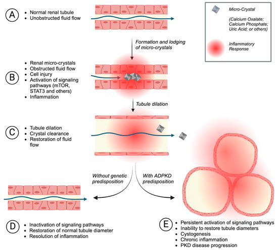 Renal crystal-mediated injury, inflammation, tubule dilation, and ADPKD progression. A normal renal tubule with unobstructed fluid flow (A). Diet, dehydration, or medication-induced deposition of microcrystals (most commonly consisting of oxalate, uric acid, or phosphate) causes obstruction of renal fluid flow, renal injury, and inflammation (B). The renal tubule dilates to allow for crystal clearance and to re-establish normal fluid flow (C). Without any genetic predisposition, temporary microcrystal injury, inflammation, and tubule dilation are resolved (D). In ADPKD patients, crystal-mediated inflammation and injury can initiate or accelerate renal cyst growth and disease progression (E).