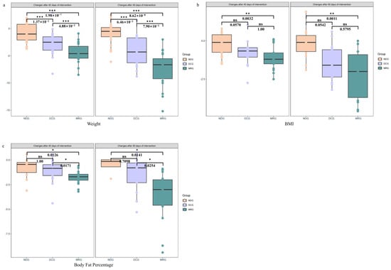 Changes in anthropometric measurements among the three groups of study subjects. Weight (a); BMI (b); Body Fat Percentage (c). NDG: Normal diet group; DCG: Diet control group; MRG: Meal replacement group. ***: p < 0.001; **: 0.001 < p < 0.01; *: 0.01 < p < 0.05; ns: no significant. Kruskal–Wallis test was used and pairwise test for multiple comparisons was performed using Bonferroni’s p-adjustment method.