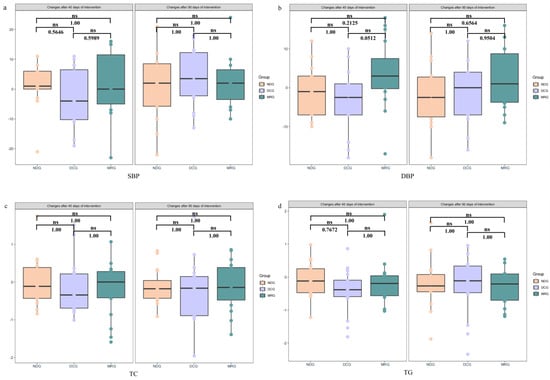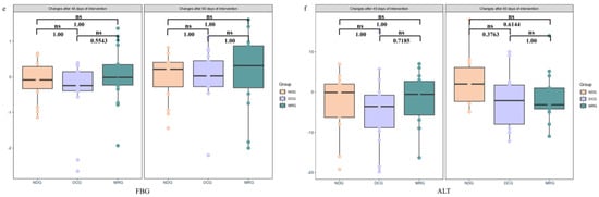 Changes in metabolic Indicators among the three groups of study subjects. SBP (a); DBP (b); TC (c); TG (d); FBG (e); ALT (f). NDG: Normal diet group; DCG: Diet control group; MRG: Meal replacement group. ns: no significant. Kruskal–Wallis test was used and pairwise test for multiple comparisons was performed using Bonferroni’s p-adjustment method.