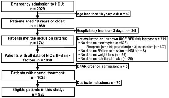 Among 2029 patients admitted urgently to our HDU from 1 December 2016 to 30 April 2019, we excluded 1074 based on the criteria mentioned (Figure 1). Of these, 248 patients were excluded due to a short hospital stay (i.e., less than three days), and 711 patients were excluded because at least one or more of the RFS risk factors were not evaluated. Ultimately, 955 cases were included for analysis.