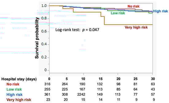 The distribution of patients across the RFS risk categories of the no-, low-, and high-risk groups was comparable, but markedly lower in the very high-risk group (Table 2). There was a wide distribution of risk factors (e.g., BMI, BW loss, and reduced nutritional intake) among the risk categories. Patients with low electrolyte levels upon admission were predominantly found in the high-risk group. The very high RFS risk group exhibited the highest 30-day mortality rate (21.7%), whereas no significant difference in 30-day mortality was observed in the very high RFS risk group; no significant difference in 30-day mortality was observed between the high-risk group and the no-risk group (i.e., 5.0% vs. 4.4%). Kaplan–Meier analysis, with mortality censored at 30 days after HDU admission, showed a markedly lower survival probability over time in the very high-risk group, with no significant difference among the remaining groups (log-rank trend test: p = 0.047) (Figure 2). In multivariable logistic regression (primary analysis with the smallest AIC), adjusting for sepsis, CCI, and age, only the very high-risk group was significantly associated with 30-day mortality (OR 5.54 95%CI 1.73–17.79). Elevated risks for secondary outcomes were also observed solely in the very high-risk group, even after adjusting for age and sepsis (Supplementary Table S4).