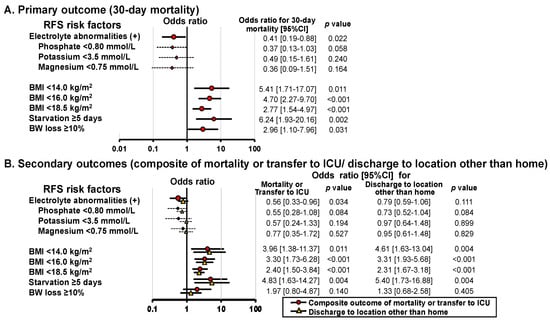 Univariable analysis of the relationship between RFS factors and the primary and secondary outcomes. The results are presented as odds ratios with 95% CIs and p-values. BMI, body mass index; BW, body weight; CI, confidence intervals; ICU, intensive care unit; RFS, refeeding syndrome.
