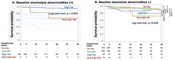 The impact of each RFS risk factor on 30-day mortality after HDU admission was assessed using univariate logistic regression analysis. Low BMI, starvation period, and BW loss were associated with increased 30-day mortality (Figure 3A). In contrast, electrolyte abnormalities on admission, particularly hypophosphatemia, were inversely associated with 30-day mortality. Similar results were obtained for secondary outcomes (Figure 3B). In multivariate analysis, which included age, BMI, starvation period, BW loss, and sepsis as covariables, electrolyte abnormalities remained a negative factor for 30-day mortality (OR = 0.45 [95%CI: 0.20–0.98], p = 0.043). Furthermore, in patients without electrolyte abnormalities upon HDU admission, the survival probability for the high-risk group decreased over time, with significant reductions compared to the no- or low-risk groups (Figure 4). Neither alcohol abuse, insulin treatment, chemotherapy, antacids, nor diuretics were related to 30-day mortality (0% [p = 1.0], 6.1% [p = 0.774], 8.3% [p = 0.484], 5.5% [p = 0.926], 6.8% [p = 0.334], respectively).