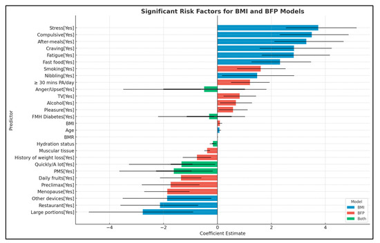 Therefore, the aim of this study is to identify and analyze the impact of a wide range of eating habits and various medical conditions on body weight, as well as the potential risk factors contributing to obesity. This will be achieved using two different classifications of nutritional status: the BMI value and the percentage of adipose tissue, assessed through electrical bioimpedance. These models were constructed to identify and quantify the impact of various predictors on the probability of obesity. By contrasting the outcomes derived from the BMI-based and BFP-based models, this study seeks to highlight the similarities and differences in obesity risk factors as determined by these two classification systems. This comparative analysis offers a more detailed understanding of how different measures of body composition may influence the identification of obesity-related risk factors.