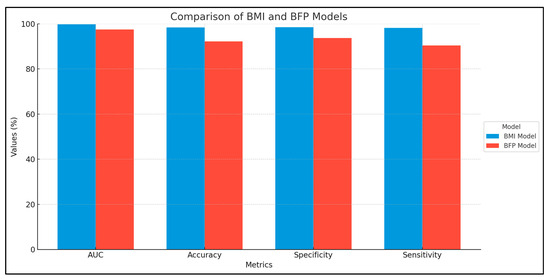 These comparative results between the two evaluated models are detailed in Table 3 and Table 4, highlighting how different methods of classification (BMI vs. BFP) reveal nuanced variations in demographic and lifestyle factors.