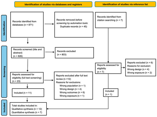 The 871 citations were retrieved from four databases: Medline (PubMed), EMBASE, CINAHL, and the Cochrane Central Register of Controlled Trial Library. Before the screening, 45 duplicates were identified and thereby removed, which then resulted in a total of 826. Further, 803 results were then excluded after screening titles and abstracts. A total number of 23 papers were consequently selected for full text article screening and were assessed for eligibility. However, 12 records were excluded due to several reasons: different population (n = 1), different study design (n = 4), outcomes other than the study aim (n = 6), and different exposure (n = 1). A table of reasons for exclusions is provided in Table S4. Furthermore, hand searching of the supplementary search including reference lists of primary studies, review papers, and previous systematic reviews and meta-analyses was carried out to ensure a comprehensive literature search strategy. This yielded a further 7 studies, and 6 of them were excluded because they did not meet the research question due to different study designs (n = 4) and different exposures (n = 2). A table of reasons for exclusions after full text is provided in Table S5. Only one study ultimately met the inclusion criteria for the qualitative synthesis. This ended up having a total of 12 papers included in the qualitative analysis, while the quantitative analysis was performed on 7 articles. Figure 1 shows the study flow diagram based on the PRISMA checklist.