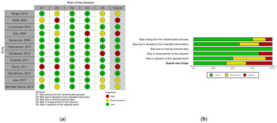 (a) Risk-of-bias summary of studies examining the effects of the omega-3 PUFA; (b) Risk-of-bias graph of studies examining the effects of the omega-3 PUFA. Done by according to Cochrane’s risk-of-bias tool for randomized trials [29,39,42,43,44,45,46,47,48,49,50,51,52].