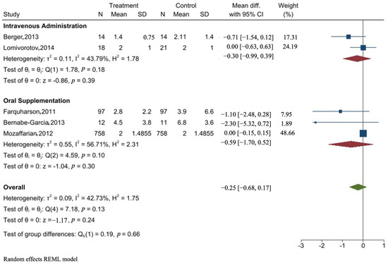 Subgroup analysis based on the method of administration was conducted and no effect was further seen on the duration of ICU stay, mean difference, and 95% confidence intervals (−0.30 [−0.99,0.39] and −0.59 [−1.7, 0.52] for intravenous and oral supplementation, respectively).