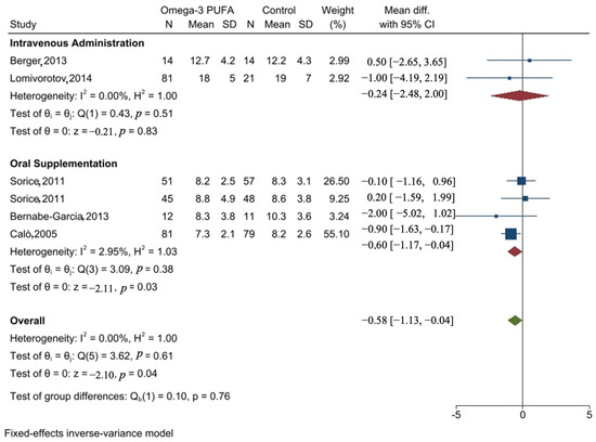 Moreover, omega-3 PUFA was associated with a significant reduction in days of hospital stay (−0.58 (95% CI −1.13, −0.04)). Furthermore, subgroup analysis showed that oral supplementation resulted in a statistically significant reduction in length of hospitalization with MD (−0.6 (95% CI −1.17, −0.04)). However, no statistically significant difference in length of hospitalization was observed when omega-3 was administered intravenously (−0.24 (95% CI −2.48, 2.00)).