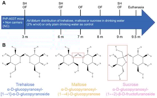 (A) Experimental timeline in mice showing the distribution of plain water or water mixed with 2% w/v of trehalose, maltose, or sucrose and in vivo tests performed. Stool harvest (SH); open field (OF); month (m). (B) Chemical formula of administered sugars: trehalose, maltose, and sucrose. Differences between the formula of trehalose and other sugars are framed in red.