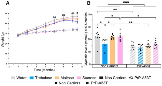 Effect of genotype and treatments on mice weight and glycemia. (A) Time course of mice’s weight from 3 m to 9.5 m of age. (B) Effect of sugar administration on blood sugar levels at the moment of euthanasia when mice are 9.5 m old. n = 7–8 mice per group. # p < 0.05, ## p < 0.01, #### p < 0.0001 for the genotype effect (NC vs. PrP-A53T), * p < 0.05, ** p < 0.01; two-way ANOVA, Tukey test.