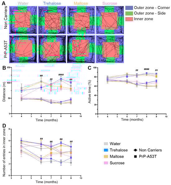 The results of the open field tests (Figure 3A–C) revealed an important increase in PrP-A53T mice motor activity with aging, and PrP-A53T mice moved more often than NC mice at 6 m (p < 0.01), 7 m (p < 0.01), 8 m (p < 0.0001), and 9 m of age (p < 0.01). Thus, PrP-A53T mice were more active than NC mice from 6 m of age, and the administration of neither trehalose, maltose, nor sucrose altered their motor activity.