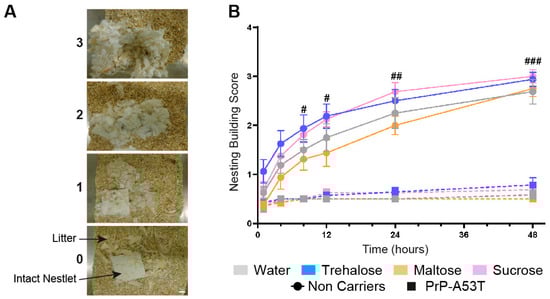 Anxiety and depressive-like behaviors were measured by the time mice spent in the inner zone of the open field (Figure 3D) and using the nesting test to score the quality of nest (Figure 4). An anxiety onset was observed from 6 m of age (p < 0.01) with less time spent in the open field inner zone than at 4 m of age. No anxiety-like behavior was observed in NC mice (Figure 3D). Nesting building scores at 9.5 m of age showed that NC mice were actively building their nest over a 48-h period, with a score progressing from 0.69 at 1 h to 2.9 at 48 h (time factor F (5, 168) = 51.57, p < 0.0001; Figure 4B). On the other hand, PrP-A53T mice built little or no nest, with scores (0.64 ± 0.08) significantly lower compared to NC mice (2.84 ± 0.17, p < 0.001) after 48 h of nesting building test, indicating the presence of anxiety and depression. Overall, these behavioral results suggest that the main effect of α-syn overexpression is development of hyperactivity and anxiety and depressive-like behavior in mice, beyond what is normally observed with age. Those behaviors were not impacted by the consumption of trehalose, maltose, or sucrose in NC mice (treatment factor F (3, 28) = 2.228, p = 0.1069) and in PrP-A53T mice (treatment factor F (3, 24) = 1.545, p = 0.2287).
