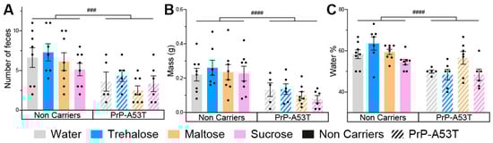 The results obtained from the analysis of intestinal motility showed that the number of feces excreted in 30 min (genotype factor F (1, 48) = 15.91, p = 0.0002; Figure 5A), their weight (genotype factor F (1, 48) = 21.57, p < 0.0001; Figure 5B), and the proportion of water in the stools (genotype factor F (1, 47) = 24.50, p < 0.0001; Figure 5C) were lower in PrP-A53T mice than NC mice at 9.5 m old. Thus, PrP-A53T mice seem to have a less active intestinal transit compared to NC mice. The intake of trehalose (p = 0.9997), maltose (p > 0.9999), or sucrose (p = 0.9446) did not significantly impact the intestinal transit in NC mice. The intake of trehalose (p = 0.9998), maltose (p = 0.9955), or sucrose (p > 0.9999) did not significantly impact intestinal transit in PrP-A53T mice.