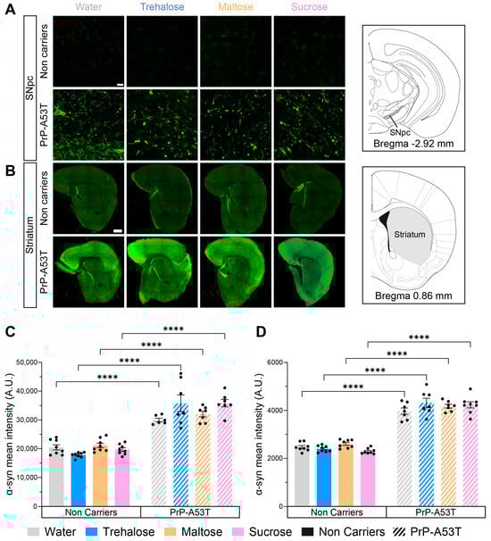 To confirm the expression and accumulation of human α-syn (h-α-syn) in the PrP-A53T mouse model, we analyzed the immunoreactivity of a specific phosphorylated serine 129 (p-S129) h-α-syn antibody in the SNpc and striatum of all mice (Figure 6). As expected, fluorescence imaging confirmed the absence of p-S129 h-α-syn in the brain of NC mice (background signal around 20,000 A.U. in the SNpc and 2400 A.U. in the striatum) and the presence of the protein in the PrP-A53T mice, in the SNpc (genotype factor F (1, 51) = 239.5, p < 0.0001; Figure 6A,C) and the striatum (genotype factor F (1, 53) = 601.0, p < 0.0001; Figure 6B,D). Furthermore, no significant effect was observed for any treatments in PrP-A53T mice (treatment factor F (3, 51) = 1.349, p = 0.2689 in the SNpc; F (3, 53) = 1.240, p = 0.3043 in the striatum), suggesting that trehalose and other sugars do not regulate accumulation and phosphorylation of h-α-syn in mice (water vs. trehalose in SNpc, p = 0.0624; water vs. trehalose in striatum, p = 0.2762). To conclude, these results confirm the presence of p-S129 h-α-syn in the CNS of PrP-A53T mice and that trehalose treatment does not modulate h-α-syn expression and phosphorylation.