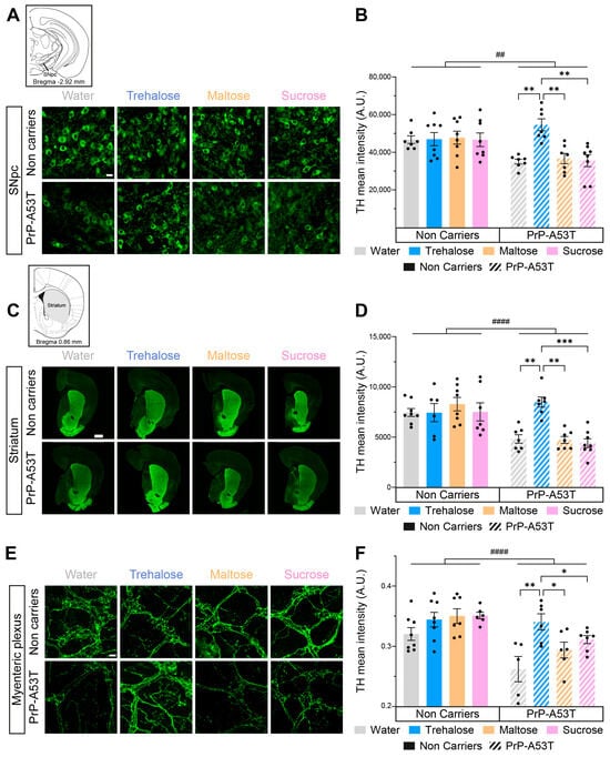 We investigated the integrity of both the nigrostriatal pathway and the myenteric plexus and the impact of trehalose intake using TH, a rate-limiting enzyme in the synthesis of DA, as a marker for DA neurons. The distribution of TH labeling is representative of what is expected from labeling of DA neurons and fibers, confirming the specificity of the antibody used. Quantification of the mean intensity of TH in SNpc revealed a 25% loss of nigral TH in PrP-A53T mice treated with water, maltose, and sucrose (genotype factor F (1, 52) = 9.197, p = 0.0038; Figure 7A,B). This loss was prevented by the trehalose treatment (p = 0.0014). TH labeling for the DA projections in the striatum showed a 38% loss of TH projections in PrP-A53T mice treated with water, maltose, and sucrose (genotype factor F (1, 50) = 24.38, p < 0.0001; Figure 7C,D), while the trehalose treatment prevented the loss of DA projections (p = 0.0018).
