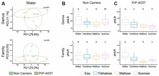 Variation in gut microbiota composition by measuring the phylogenetic beta diversity between the various groups of mice. (A) PCA of Euclidian distances calculated using PhILR-transformed abundances for the NCs and PrP-A53T mice treated with water at the genus and family levels. Each point represents a unique gut microbiome sample (n = 7–8). Ellipses show the normal-theory confidence regions. Principal components one and two explained 79.9% and 11.1% of the variation in gut microbiome structure at the genus level and 73.2% and 23.2% at the family level, respectively. p < 0.001 for each graph. (B) Beta-diversity boxplots and indices for water, trehalose, maltose, and sucrose in NC-treated mice at the genus and family levels. Tukey HSD test group letters (p < 0.05) are represented: groups with the same letter are not different; groups with different letters are significantly different. (C) Beta-diversity boxplots and indices for water, trehalose, maltose, and sucrose in PrP-A53T-treated mice at the genus and family levels. n = 7–8 mice per group. Tukey HSD test group letters (p < 0.05) are represented: groups with the same letter are not different; groups with different letters are significantly different.