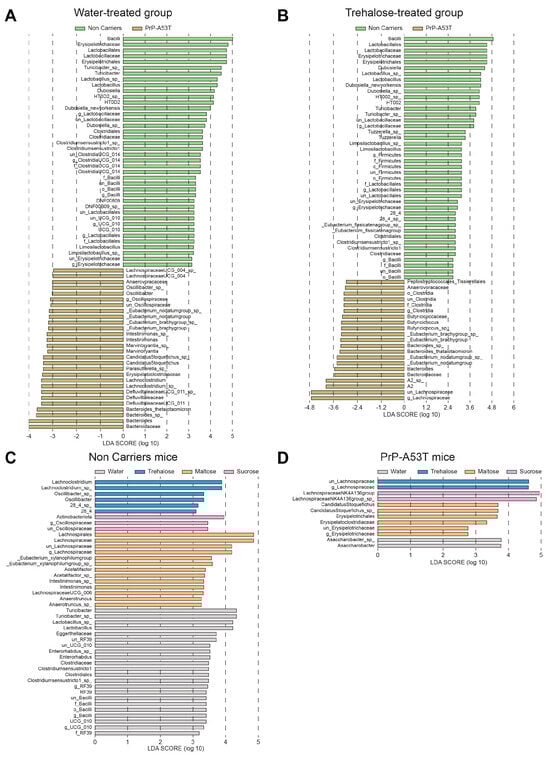 The analysis of differentially abundant taxa between NC and PrP-A53T bacterial communities of mice receiving plain water revealed 68 differentially abundant taxonomic clades with a linear discriminant analysis (LDA) score higher than 2.0 (Figure 9A). It showed that taxa identified as Bacilli, Erysipelotrichaceae, and Lactobacillaceae were significantly more abundant in NC mice’s gut microbiota, while in PrP-A53T mice, Bacteroidaceae, Bacteroides, Defluviltaleaceae, and Lachnoclostridium were significantly more abundant. For the NC mice, genera Lachnoclostridium and Oscillibacter appeared as markers of trehalose-treated mice, as were Actinobacteriota and Oscillospiraceae for sucrose-treated mice or Lachnospiraceae, Eubacterium, Acetatifactor, Intestinimonas, and Anaerotruncus for maltose-treated mice (Figure 9C). For PrP-A53T mice, those treated with trehalose showed significant increases in species of the family Lachnospiraceae, while unclassified members of the Lachnospiraceae (NK4A136 group) and taxa of the family Erysipelotrichaceae were significantly more abundant in sucrose- and maltose-treated mice, respectively (Figure 9D).