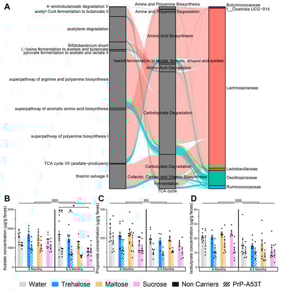Effect of genotype and treatments on gut microbiota functional markers and metabolic pathways. (A) Sankey diagram (or alluvial plot) showing the bacterial contribution to predicted functional markers in the PrP-A53T trehalose-treated mice, from feces harvested at 9.5 m of age. Left: functional microbiota selected markers. Middle: functional class or superclass. Right: contribution of the most abundant families in the microbiota. The wider the band, the greater the contribution. The functional fraction was calculated by accumulating the genome coverage values of genomes from a specific microbial group that possesses a given functional trait. The width of curved lines from a specific microbial group to a given functional trait indicates their corresponding proportional contribution to a specific metabolism. (B) Fecal acetate contents at 6 m and 9.5 m of age. (C) Fecal propionate contents at 6 m and 9.5 m of age. (D) Fecal isobutyrate contents at 6 m and 9.5 m of age. n = 7–8 mice per group. * p < 0.05, ** p < 0.01, $$$ p < 0.001, $$$$ p < 0.0001 for the age effect (6 m vs. 9.5 m); three-way ANOVA, Tukey test.
