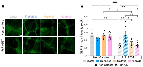 Given the observed hypoglycemic effect of trehalose in Figure 2B, we wanted to investigate enteric GLP-1 abundance since it is an incretin secreted in the gut in response to the presence of glucose in the intestinal lumen. Therefore, we performed an immunofluorescence on GLP-1 in the myenteric plexus (Figure 11A). The distribution of GLP-1 immunoreactivity is consistent with what is expected of this type of labeling, confirming the specificity of the antibody used [54]. Immunoreactivity analysis revealed a significantly lower level of GLP-1 (22%) in PrP-A53T mice compared with NC littermates (genotype factor F (1, 48) = 24.84, p < 0.0001; Figure 11B). The intake of trehalose increased the concentration of GLP-1 in PrP-A53T mice compared with those maintained on plain water (p = 0.0061). These results show that the PrP-A53T genotype reduces the production of GLP-1 and that trehalose treatment restores its levels.