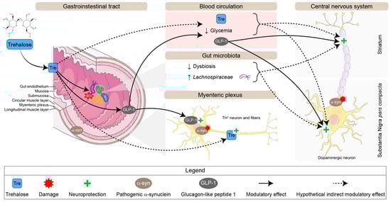 To this day, PD is incurable; the available pharmacological treatments can only attenuate motor dysfunctions with no effect on disease progression [24]. It is, therefore, essential to seek alternative solutions to protect dopaminergic neurons. Several studies have shown the importance of diet on the development of PD and the potential of nutraceutical treatments [25,26]. In this regard, trehalose (O-α-D-glucopyranosyl-[1→1]-α-D-glucopyranoside) is a disaccharide composed of two molecules of glucose, found primarily in plants, fungi, archaea, bacteria, and insects [27]. The available literature presents some evidence of neuroprotective abilities related to trehalose intake in models of PD [28,29]. Oral administration of trehalose has been shown to improve motor function and survival in animals modeling proteinopathies, reduce astrogliosis in Parkin knock-out (KO) mice, and protect against striatal dopamine loss in the MPTP (1-methyl-4-phenyl-1,2,3,6-tetrahydropyridine) model of PD [28,29,30]. Interestingly, trehalose would be neuroprotective only when administered orally in animals [30]. However, the mechanisms of action surrounding this neuronal protection are little or not identified. The mechanism of transport of trehalose through the different physiological barriers is still poorly understood, and it is necessary to mention that vertebrates do not have the capacity to produce trehalose endogenously or to transport it actively since they do not have the intestinal membrane transporters needed [27,30]. A direct action of trehalose on the neurons of the nigrostriatal pathway is therefore unlikely. Nevertheless, trehalose metabolites (glucose) or indirect effects via the gut microbiota could be involved. Indeed, several studies demonstrated the ability of trehalose to promote the proliferation of specific gut bacteria [31,32]. Trehalose can be cleaved into two molecules of glucose by the bacterial and mammalian intestinal enzyme trehalase.
