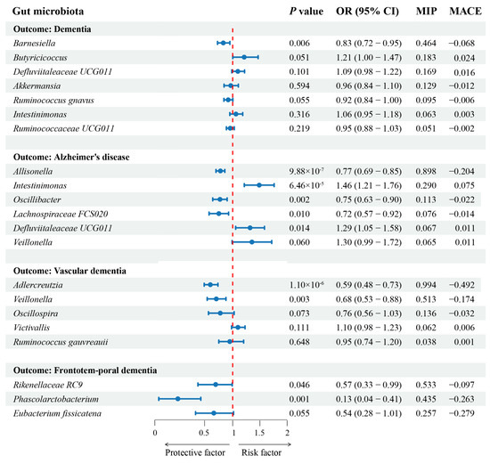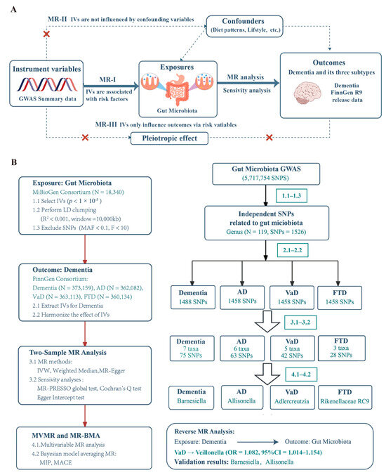 - Fu, J.; Qin, Y.; Xiao, L.; Dai, X. Causal relationship between gut microflora and dementia: A Mendelian randomization study. Front. Microbiol. 2024, 14, 1306048. [Google Scholar] [CrossRef] [PubMed]