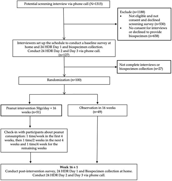 The Vietnam Peanut Trial Study recruited one hundred study participants and randomly assigned them to a peanut intervention group or a control group from April 2019 to Jun 2020 (The International Traditional Medicine Clinical Trial Registry: ITMCTR2024000050). The participants for the trial were recruited from a colorectal cancer screening project in Hanoi, Vietnam, known as the Vietnam Colorectal Cancer and Polyps Research (VinCAPR). The design and methods for the VinCAPR have been described in detail elsewhere [31]. Briefly, the VinCAPR project involved 103,542 residents in Hanoi aged 40 or older and used a two-step modality with an immunochemical fecal occult blood test (iFOBT) followed by a colonoscopy for those who tested positive. The potential participants were selected from the pool of screeners who tested negative for iFOBT. The inclusion criteria for the trial were as follows: (1) aged between 40 and 70; (2) did not consume peanuts or other tree nuts/seeds more than one time per week; (3) self-reported diabetes/prediabetes, but not on diabetes medications; and (4) self-reported dyslipidemia, but not on lipid- or triglyceride-lowering medications. Individuals who met any of the following conditions were not eligible for the study: (1) known or suspected allergy to peanut/peanut-containing products; (2) diagnosed with any kidney disease, liver disease, heart attack, stroke, other cardiovascular disease, or cancer; (3) drank more than two units of alcohol (two cups of wine, two shots of liquid, or two cans of beer) daily; (4) current or recent use of diabetes medications or lipid- or triglyceride-lowering medications in the past three months; (5) hospitalized in the past three months; (6) received chemotherapy, immune suppressive treatment, or antibiotics during the past three months; or (7) gained or lost more than 2.5 kg of weight in the past three months. A phone screening interview was then conducted to identify approximately 1315 potential candidates. Finally, one hundred participants were selected from the potential candidates (Figure 1). The sample size of 100 participants was determined to ensure the trial was adequately powered to detect a minimal mean difference of 0.566 standard deviations between the peanut intervention and control groups.