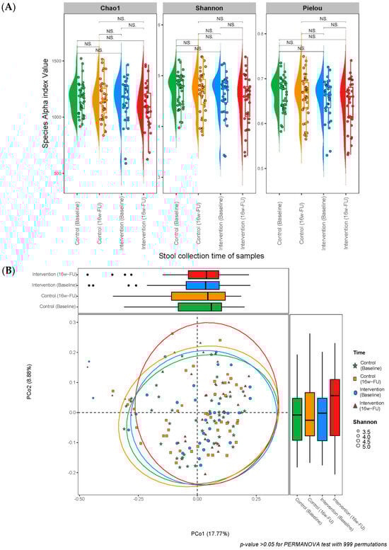 (A) Alpha diversity at the species level (measured in terms of the Chao1 richness, Shannon-Wiener diversity, and Pielou indexes) over time. (B) Principal coordinate analysis (PCoA) of Bray–Curtis diversity over time. (C) Beta diversity changes within individual subjects over time by the trial groups in principal coordinate analysis (PCoA) of Bray–Curtis diversity. (D) Relative abundance by study group over time. Abbreviation: 16w–FU: 16-week follow-up; NS.: Non-significant.