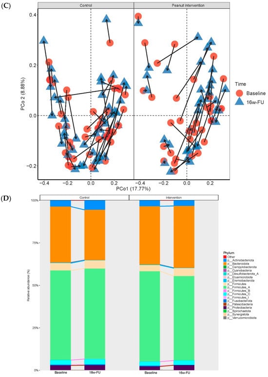 Covariate-adjusted linear mixed-effect models showed that peanut intervention was significantly associated with a reduced abundance of 12 microbial taxa, including five phyla, five classes, and two orders after FDR correction (FDR < 0.1). We found that peanut intervention was significantly associated with a reduced abundance of phylum Actinobacteriota, with a β coefficient of −0.915 (SE: 0.315; p = 0.004 and FDR = 0.035), which was driven by its class Coriobacteriia (β [SE] = −1.041 [0.222]; p = 6.58 × 10−6; FDR = 9.22 × 10−5) and order Coriobacteriales (β [SE] = −0.991 [0.243]; p = 7.56 × 10−5; FDR = 0.003). The phylum Firmicutes (β [SE] = −0.685 [0.242]; p = 0.005; FDR = 0.035) and its class Bacilli (β [SE] = −0.690 [0.228]; p = 0.003; FDR = 0.020) and order Erysipelotrichales (β [SE] = −0.799 [0.243]; p = 1.25 × 10−3; FDR = 0.023) were less abundant after peanut intervention. Additionally, peanut intervention was significantly associated with a reduced abundance of phylum Firmicutes A, with a β (SE) of −0.314 (0.137); p = 0.024 and FDR = 0.065, which was driven by its class Clostridia (β [SE] = −0.318 [0.126]; p = 0.012; FDR = 0.053). Last but not least, the abundance of three phyla, including Proteobacteria and Synergistota, was significantly decreased after peanut intervention, with a respective β of −0.814 (SE: 0.341; p = 0.018 and FDR = 0.065) and −0.762 (SE: 0.336; p = 0.025; FDR = 0.065), which was driven by their classes, including class Gammaproteobacteria (β [SE] = −0.861 [0.350]; p = 0.015; FDR = 0.053) and class Synergistia (β [SE] = −0.769 [0.336]; p = 0.023; FDR = 0.066), respectively (Table 3). Changes in the relative abundance of these taxa between 16-week follow-up and baseline were shown in Supplementary Table S3 and Supplementary Figure S2.