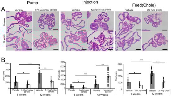 Morphological changes in the fallopian tube at 8 and 12 weeks of age following treatments. (A) Representative H&E sections of the FT in the vehicle- and vitamin D-treated mice at 8 and 12 weeks of age following treatments in the 3 groups. Images were captured at 2× magnification. Scale bar: 1 mm. (B) Average cross-sectional area (pixel units) of the FT in Pump group at 8 weeks (vehicle (n = 65) and EB1089 (n = 47) and 12 weeks (vehicle (n = 57) and EB1089 (n = 45), Injection group at 8 weeks (vehicle (n = 52) and EB1089 (n = 65) and 12 weeks (vehicle (n = 55) and EB1089 (n = 39) and feed group at 8 weeks (vehicle (n = 60) and Chole (n = 61) and 12 weeks (vehicle (n = 55) and Chole (n = 54). mean ± SEM, * (p < 0.05), ** (p < 0.005), *** (p < 0.0005), t-test.
