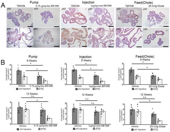 p53 positivity in the FT at 8 and 12 weeks of age following treatments. (A) Representative IHC staining of p53 at 8 and 12 weeks following treatment with vehicle and vitamin D in the 3 treatment groups. Images were captured at 2× magnification. Scale bar: 1mm. (B) Quantification of the p53 signatures and STIC lesions in the FT following treatment with vehicle (n = 10) and vitamin D (n = 10) at 8 at 12 weeks in the pump, injection, and feed treatment groups. Not significant (n.s.), mean ± SEM, * (p < 0.05), t-test.